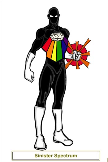Harold Lindberg grew up in Scottsville, Kentucky, with his parents Tom and Sarah and younger sister Betsy. Upon completion of high school with honors he went on to the University of Louisville where he got his masters degree in Ancient Middle-Eastern Civilizations (1976). Two years later on an Egyptian archeological dig lead by Professor Badhir, the group uncovered the Temple of Amatec, a burial shrine to an ancient king. On the dig, Lindberg discovered a gem stone along with other artifacts. Upon touching the stone, Setar's will was released and overtook that of Lindberg's, allowing the ancient wizard to live through the man. Upon seeing reports of beings with great power (heroes and villains), Setar decided to adopt a costumed identity of his own and began to call himself the Sinister Spectrum. The villain had many run-ins with the Justice Gang. One member in particular did the villain feel a certain connection to - Star Light, whose power gem was connected to the ancient wizards of long ago. Once Lindberg and his stone were seperated, the man appeared to no longer have any recollection of his actions since the dig in 1978. Even intense mental probing failed to yield any traces of the memories of the super-criminal. Freemont Traynor, his lawyer, got him released on a plea of temporary insanity. The gemstone was returned to the Egyptian government but was stolen a few years later by Arab terrorists. Star Light again battled the villain and seperated the gem from the man. This time she took it back to the Justice Gang's satellite for safe keeping. In 1986, Mystifier of the Protectors borrowed the stone to take two thin slivers to help improve the powers of one of his teammates. The gem disappeared by the hero's mansion before he could return it to the Justice Gang. In the early summer of 1990, the Spectrum reappeared and focused his attentions on Baltimore's Dillin Memorial museum and the Eye of Inja gemstone imbedded in a statue. It was there that he released Mekona, now calling herself Crystaline from her captivity. The two fought a group of local heroes who eventually formed the team Rough Justice but were not detained by the authorities. The heroes tracked the couple down a month or so later and fought them once more. Before that though, the couple got married, thus renewing their ancient love affair in modern times.